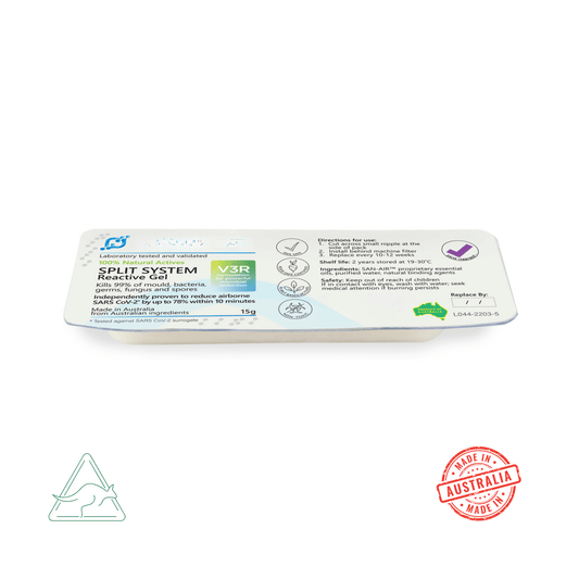 Our Australian-made Gel Diffuser is the perfect addition to your split system air conditioner, providing cleaner, healthier air in your home or workplace. With 100% natural ingredients and proven to reduce up to 95% of airborne bacteria and viruses, it tackles odours, mould, and allergens that trigger respiratory issues. Safe for all, including babies, pets, and pregnant women, it offers long-lasting freshness while extending your AC unit's efficiency.